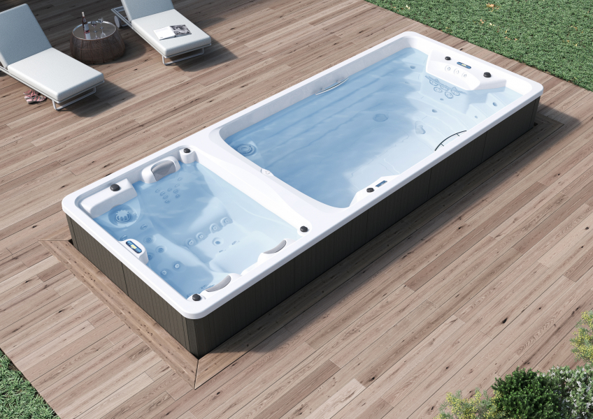 Nejnovější swimspa se jmenuje Duo: dvě úplně oddělené oblasti, abyste si mohli vychutnat verzi "plavat" zatímco jiní se uvolní ve vířivce. Koneckonců, fyzické cvičení, ať už se jedná o protiproudní koupání nebo o jakýkoli jiný aquafitness, činnost, obvykle vyžaduje teploty, které jsou mnohem nižší než hydromasážní vana. Dvě ergonomické sedadla a lehátko na jedné straně; pět protiproudových trysek a vertikální hydromasážní prostor na straně druhé.